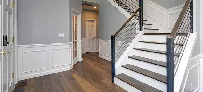 DIVIDE & CONQUER Moulding and trim can be an excellent tool for visually dividing a room. Use chair rail or picture moulding to break up large, flat spaces. This large foyer features classic white wainscoting that helps guide the eye through the room. The historical flair paired with hardwood floors and sleek cable rail is a striking contrast that gives the room a fresh and modern look.