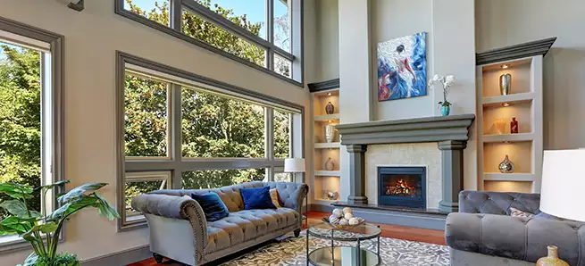 DRAMATIZE Don’t get us wrong – we’re big fans of classic white trim. It coordinates with everything and it’s all but guaranteed to never go out of style. However, there are times when architecture and décor call for something a little more – well, dramatic. The spacious living room seen here features huge windows and a high ceiling. By opting for a stately shade of gray, the trim frames and anchors the room’s architectural features in a way that simple white can’t. Repeating the gray throughout the room in baseboard molding, mantel, and crown molding keeps the striking window trim in check. Wood molding and trim can be used to similar effect.